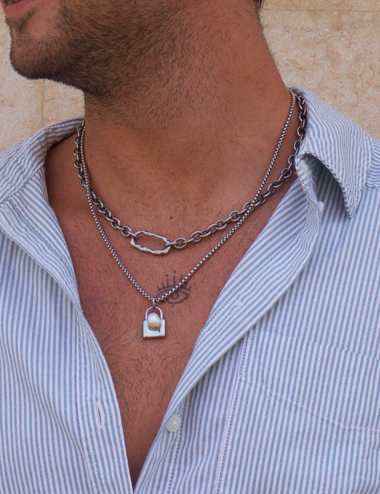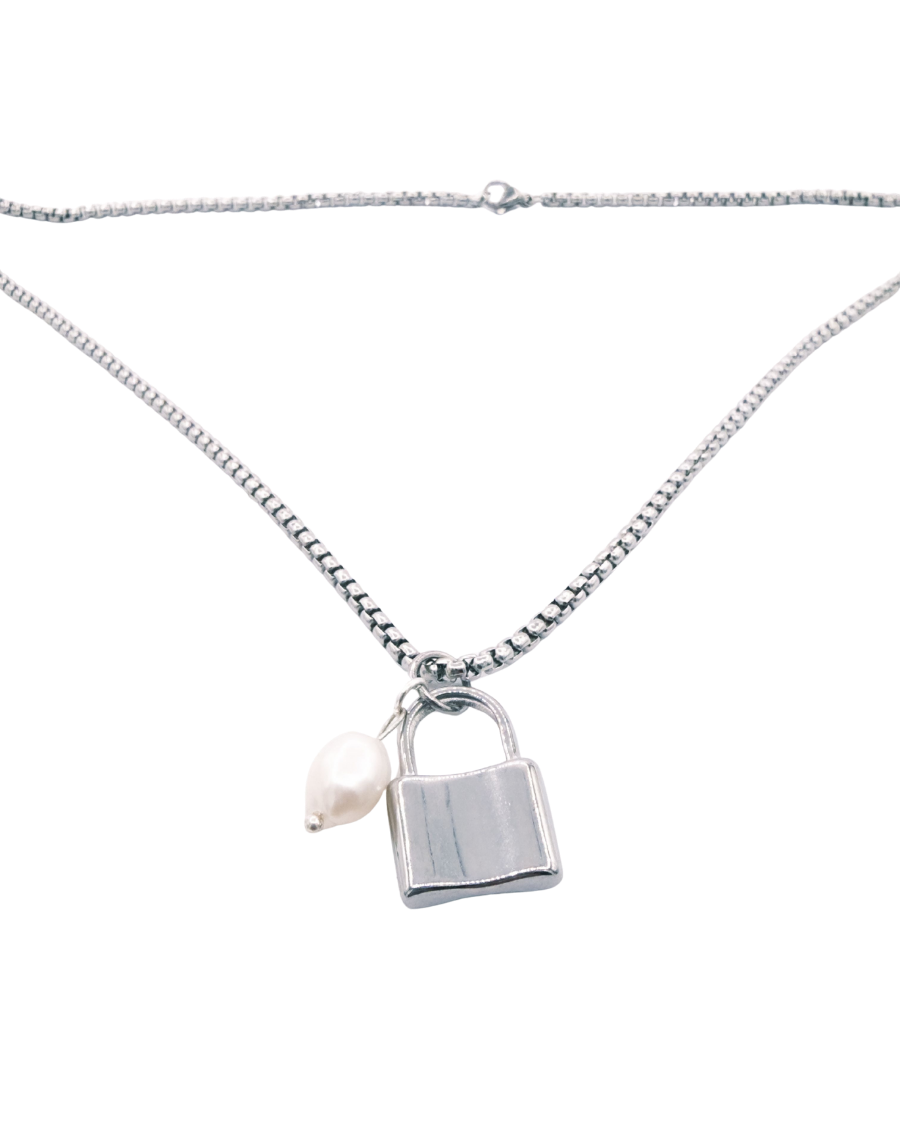 Cadena de acero inoxidable con charm de acero inoxidable y perla natural.